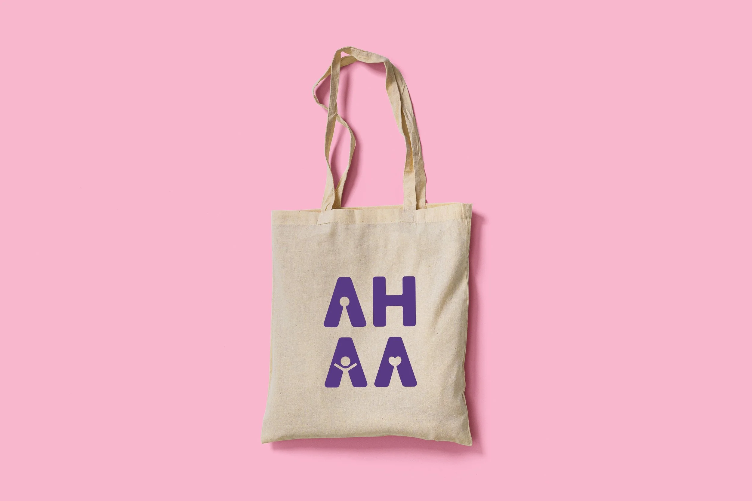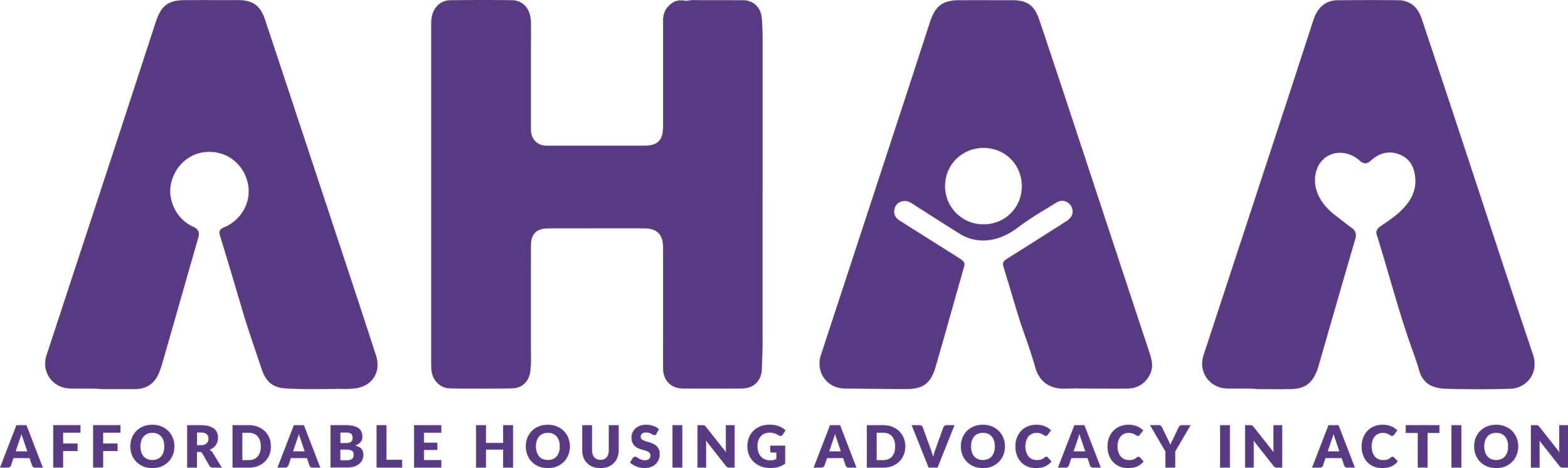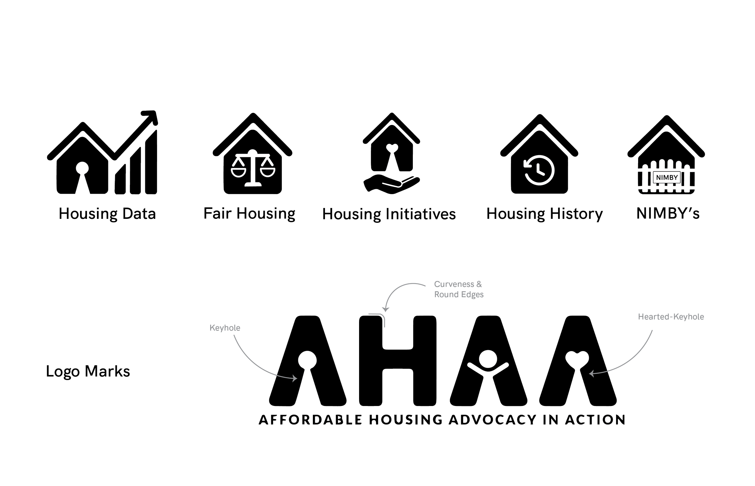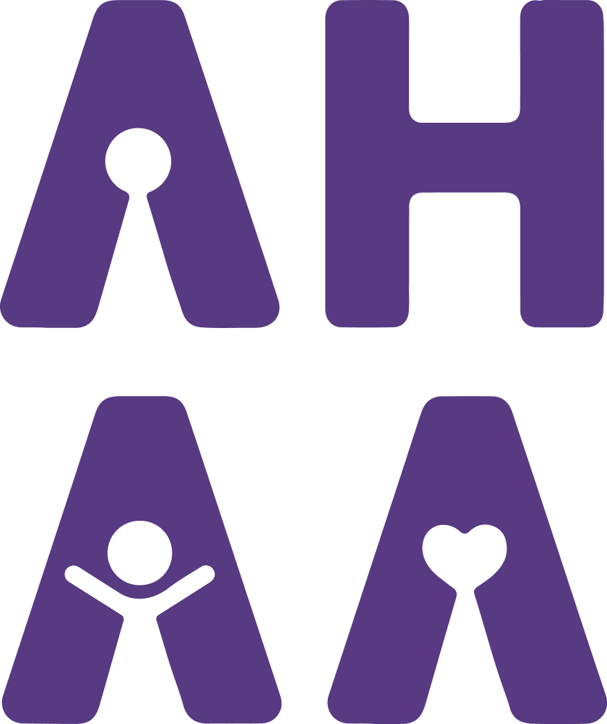 The AHAA logo creatively integrates human-like figures within the letterforms to symbolize opportunity, housing, community, and connection.