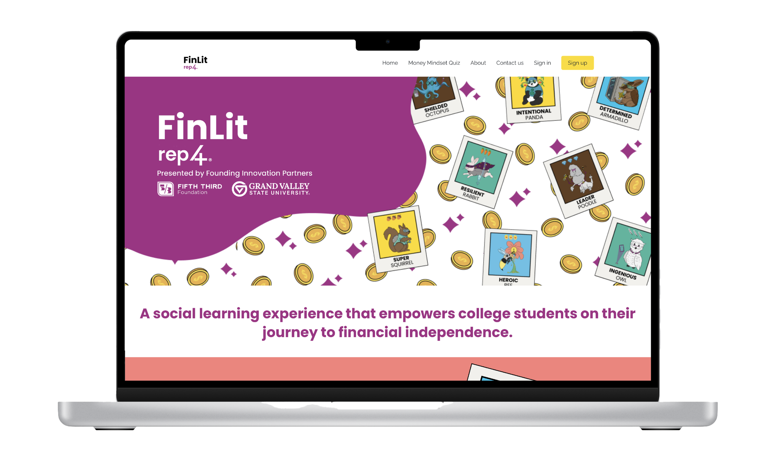 Built with a Y2K-futurist aesthetic, REP4FinLit uses accessible language, relatable examples, and visual metaphors to engage college students aged 18–30, especially those new to managing money. Its approach emphasizes autonomy, goal-setting, and decision-making transparency, making abstract finance concepts tangible and actionable.